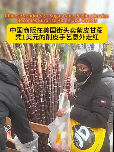凭1美元的削皮手艺意外走红 中国商贩美国纽约卖甘蔗,大排长队,网友:我还以为楼下水果店呢。 情绪价值消费# A Chinese vendor selling purple sugarcane in New York is drawing long lines! One online comment ...