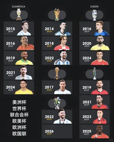 美洲杯MVP 2015年:梅西(阿根廷) 2016年:桑切斯(智利) 2019年:阿尔维斯(巴西) 2021年:梅西(阿根廷) 2024年:罗德里格斯 (哥伦比亚) 世界杯MVP 2014年:梅西(阿根廷) 2018年:莫德里奇(克罗 ...